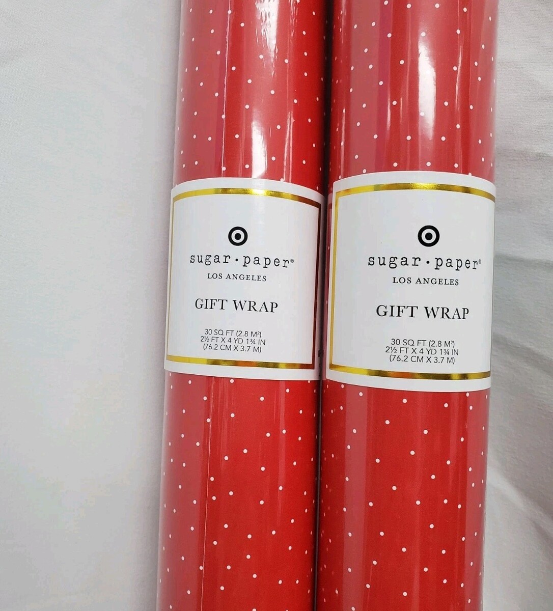 The product is a 30 sq ft white tiny scatter dot on red gift wrap by Sugar Paper. It features a polka-dot pattern and is perfect for all occasions, especially Christmas. The wrapping paper roll is 2.5ft long and comes in a vibrant red color, making it a stylish and festive choice for wrapping gifts. Personalization is not available.