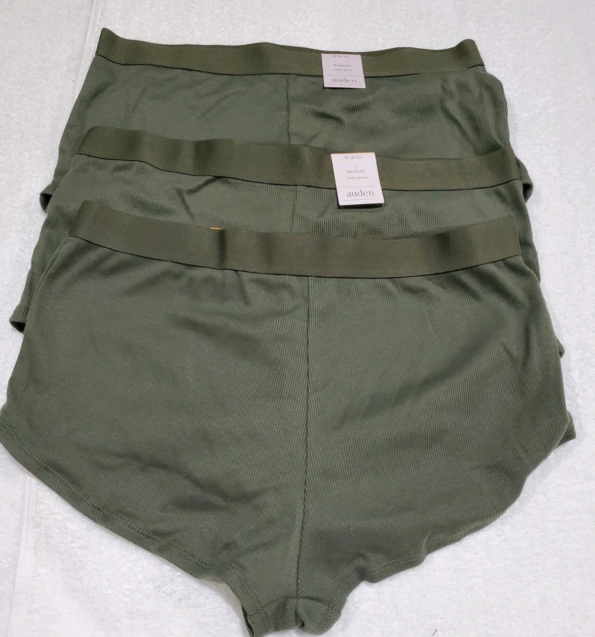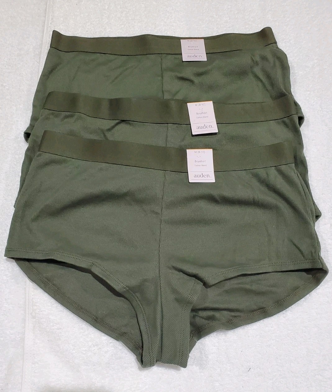 The product is a set of three pair of medium-sized (8-10) boyshorts for women in a solid olive color. Made from a comfortable cotton blend material with a blended fabric type, these panties are lightweight and stretchy, making them suitable for everyday wear. The Auden brand ensures quality and reliability in this intimates category, offering a regular size fit for women looking for both style and comfort in their underwear collection.
