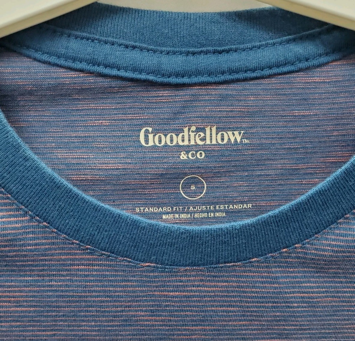 The Goodfellow & Co Men's Standard S Fit SS Pocket T-Shirt in Blue/Pink Stripes is a stylish and versatile addition to any man's wardrobe. Made from a blend of recycled polyester and cotton, this knit shirt features a classic crew neck and short sleeves, making it perfect for all seasons. The shirt also includes a chest pocket and eye-catching stripes, adding a pop of color to a timeless design. Machine washable and manufactured in India, this shirt is a comfortable and sustainable choice for everyday wear.