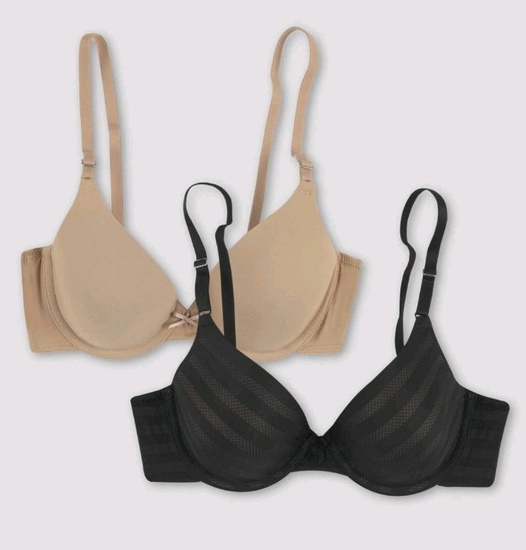 The Maidenform Women's T-Shirt Bra 2-Pack in size 38DD offers a comfortable and supportive option for everyday wear. With a solid and striped pattern in black and beige, this underwired bra features normal straps and a hook & eye closure. Made from a blend of nylon and spandex, this full coverage bra is seamless and adjustable, providing a reliable and opaque fit for women looking for both style and functionality in their lingerie collection. The Maidenform Comfort Devotion product line ensures quality and a personalized feel for the modern woman.